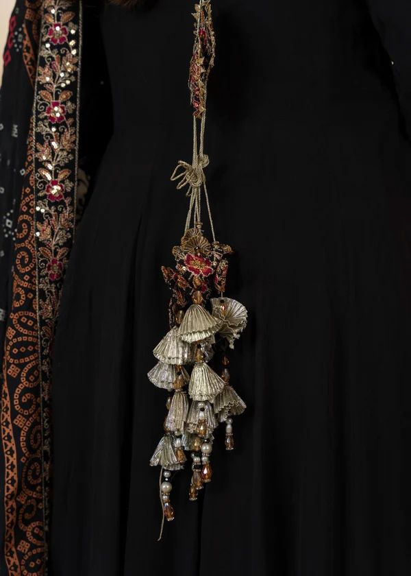 Maxi: Crafted in premium chiffon with embroidered borders all around, featuring intricate Adda work on the front neckline and a fully embroidered back adorned with a handmade heavy tassel.