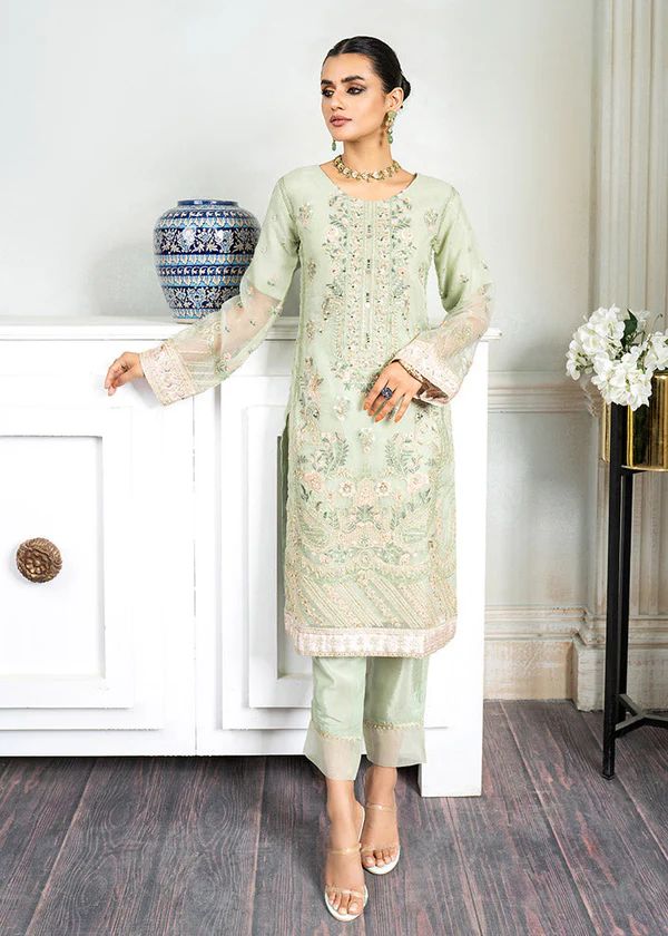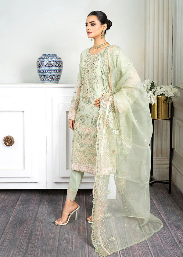 Dupatta: Organza dupatta adorned with fine embroidery and bordered detailing, adding a graceful and festive touch.