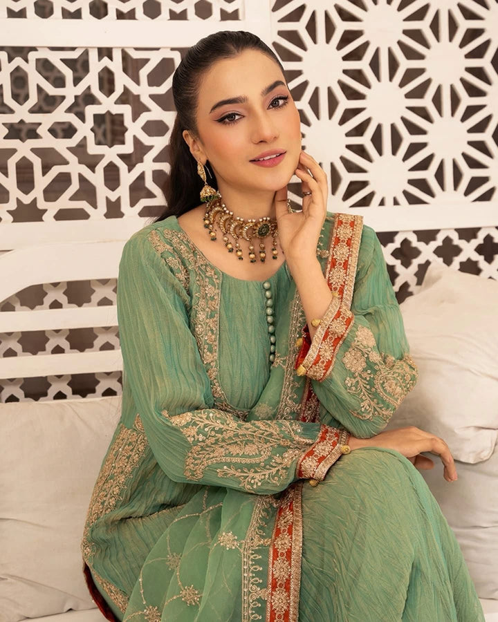 Shirt: Masuri fabric in a soft pistachio hue, featuring multihead embroidery on the upper body with center embellishment buttons along the neckline for a refined touch.