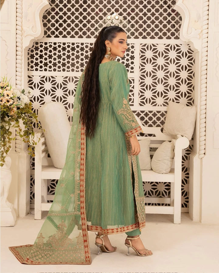 Pistachio Charm – Masuri Shirt with Multihead Embroidery & Organza Dupatta