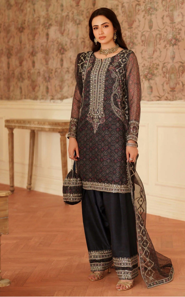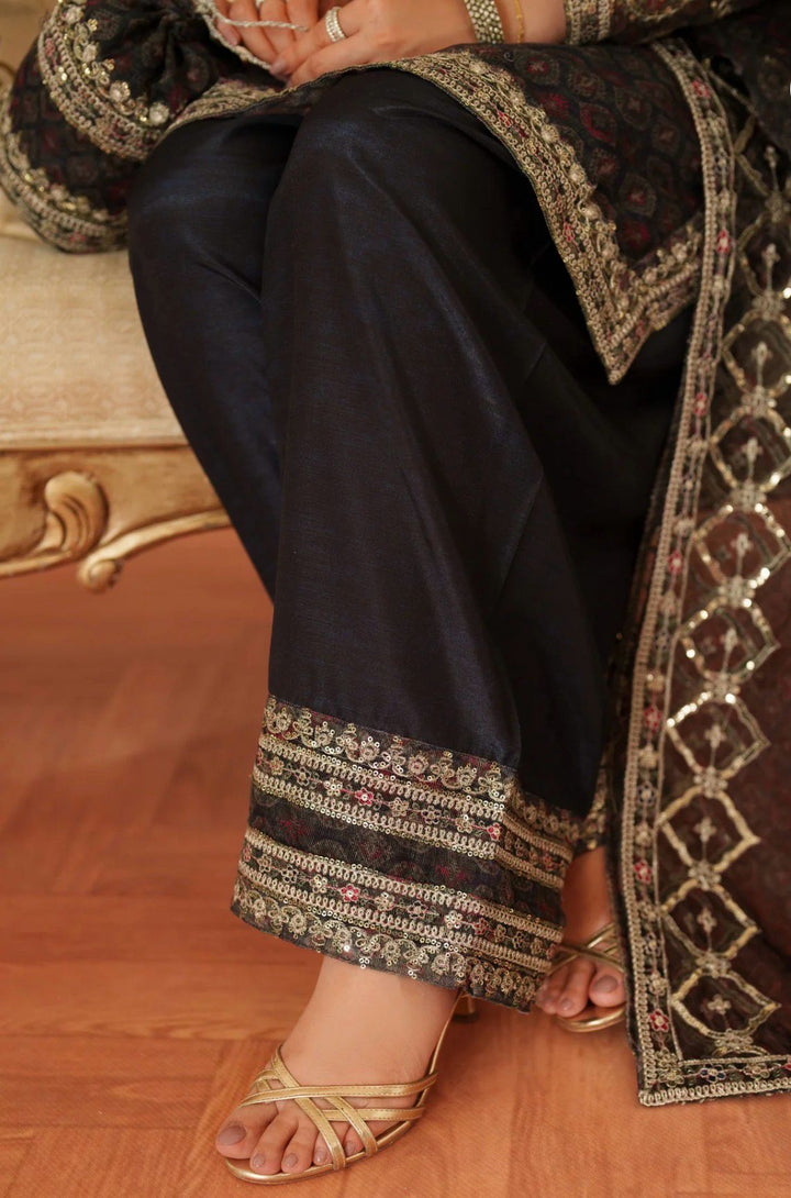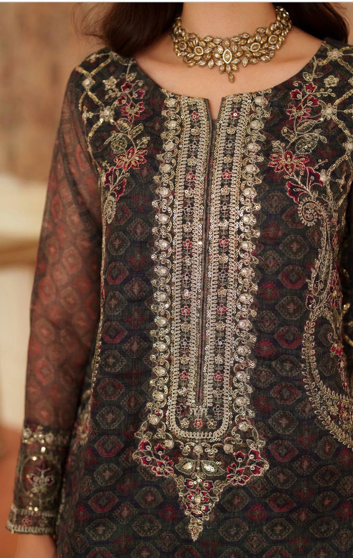 A refined 3-piece outfit featuring a printed blended khaddar shirt enhanced with embroidered patches, paired with a matching blended khaddar plazo. The look is completed with a printed monar dupatta finished with delicate lace for an elegant touch.