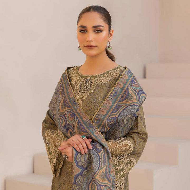 • Luxurious wool shawl paired to elevate the outfit, adding softness and sophistication for the winter season.